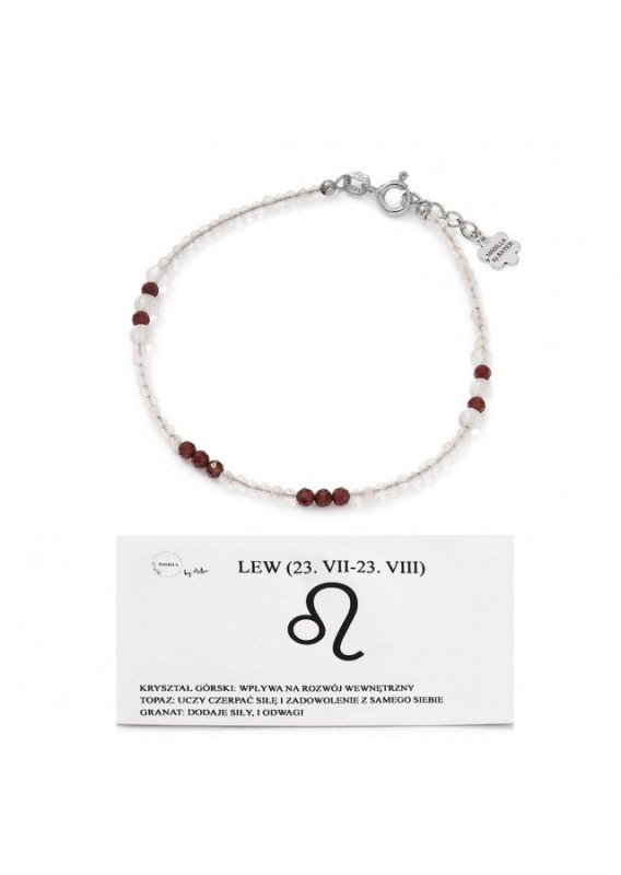 LEW - 23 lipca - 23 sierpnia Bransoleta wykonana ze srebra próby 925 , rodowanego Kamień: Kryształ górski wpływa na rozwój wewnętrzny/ Topaz uczy czerpać siłę i zadowolenie z samego siebie/ Granat dodaje siły i odwagi Rozmiar kamienia: 3 mm/2mm Długość :17,5 cm + przedłużka do 20 cm Produkt wykonywany ręcznie.