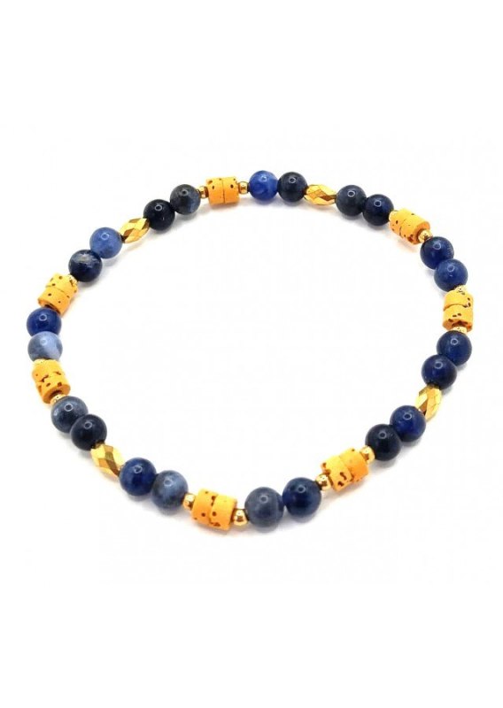 Bransoletka wykonana ze srebra próby 925, pozłacanego 24 karatowym złotem. Kamień:Sodalit/ Lawa/ Hematyt Rozmiar kamienia: 4/2mm Długość: 17,5 cm  Zapięcie: gumka Bransoletka może być wykonana na zapięciu- prosimy o informację w uwagach do zamówienia Biżuteria ręcznie wykonana, produkt Polski.