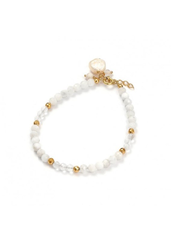 Bransoletka wykonana ze srebra próby 925 , pozłacanego 24 karatowym, żółtym złotem Kamień: Kamień księżycowy + Hematyt + Kryształ górski +perła Rozmiar kamienia: 4 mm/2mm Długość : 17,5 cm + przedłużka do 19,5 cm