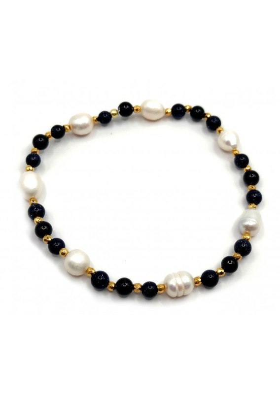 Bransoletka wykonana ze srebra próby 925, pozłacanego 24 karatowym złotem. Kamień: Perła + Turmalin i Hematyt Rozmiar kamienia: 4/2mm Długość: 17,5 cm  Zapięcie: gumka Bransoletka może być wykonana na zapięciu- prosimy o informację w uwagach do zamówienia Biżuteria ręcznie wykonana, produkt Polski.