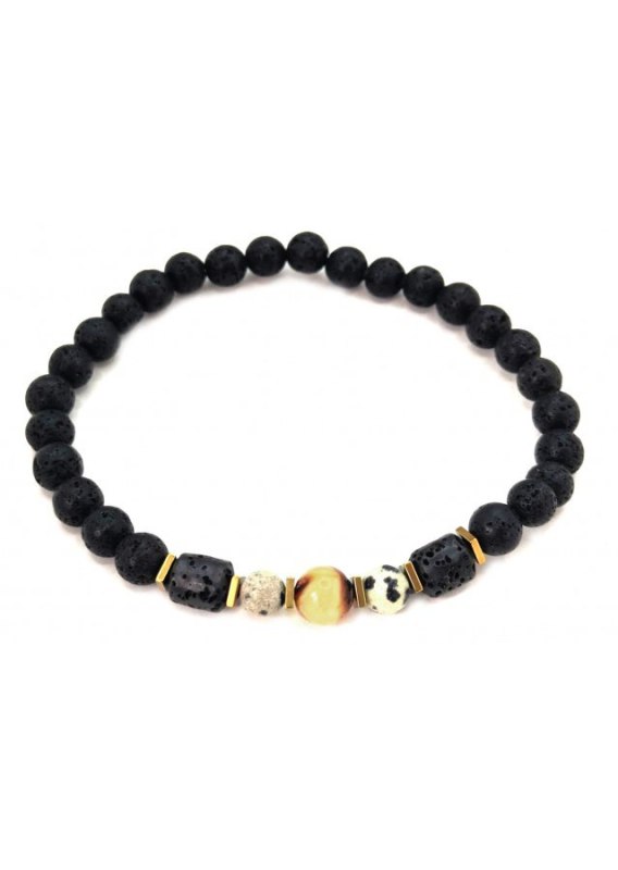 Bransoletka wykonana na gumce Kamień: Hematyt+ Bursztyn+ Lawa + Jaspis Rozmiar kamienia: ok 6 mm Rozmiar uniwersalny. Produkt wykonywany ręcznie.