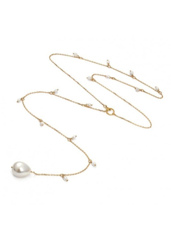 Naszyjnik wykonany ze srebra próby 925 , pozłacanego 24 karatowym, żółtym złotem Kamień: Kamień księżycowy +perła Rozmiar kamienia: 4 mm / 13x17 mm Długość :szyja: 42 cm + łańcuszek na plecy ok 25 cm . Naszyjnik może być noszony również z łańcuszkiem z przodu