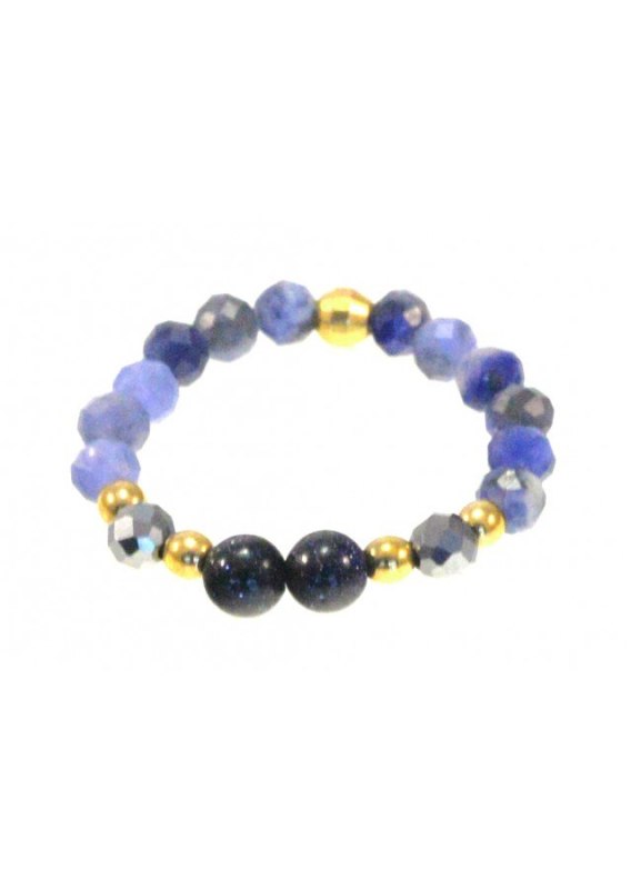 Kamień: Sodalit+ Teraherz+ Hematyt + Noc kairu+ srebrny element, pozłacane 24 karatowym żółtym złotem Pierścionek wykonany na bardzo wytrzymałej gumce, odpornej na uszkodzenia.  Rozmiar kamienia: 2/3/4 mm Rozmiar uniwersalny. Produkt wykonywany ręcznie