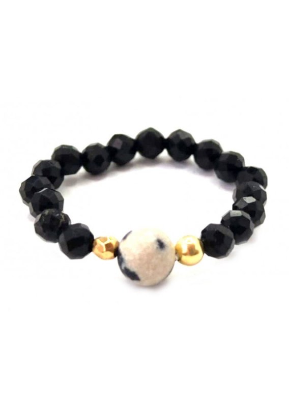 Kamień: Turmalin / Jaspis+ srebrny element, pozłacane 24 karatowym żółtym złotem Pierścionek wykonany na bardzo wytrzymałej gumce, odpornej na uszkodzenia.  Rozmiar kamienia: 3/4 mm Rozmiar uniwersalny.