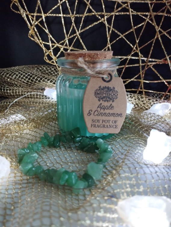 zestaw upominkowy - świeczka o subtelnym i delikatnym zapachu , kombinacja jabłka i cynamonu w zestawie z bransoletką z jadeitu