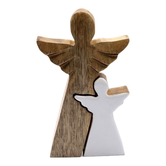 Anioł z Drewna Mango z Małym Aniołem - Biała Emalia - 15 cm