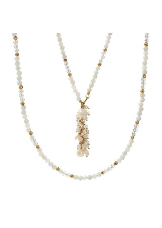 Naszyjnik wykonany ze srebra próby 925 , pozłacanego 24 karatowym, żółtym złotem Kamień: Kamień księżycowy + Hematyt + Kryształ górski +perła Rozmiar kamienia: 4 mm/2mm /6mm Długość :szyja: 42 cm + przedłużka do 49 cm