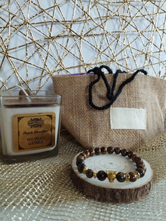 Szukasz idealnego prezentu dla bliskiej osoby? Zestaw upominkowy, który składa się z uroczego ekologicznego koszyczka wyściełanego delikatną podszewką zawierającego świeczkę o zapachu soczystej brzoskwini oraz elegancką bransoletkę z kamieni naturalnych tygrysiego oka to właśnie to, czego potrzebujesz! Świeczka wykonana jest z naturalnego wosku sojowego, co sprawia, że pali się wolniej i bezpieczniej niż standardowe świece. Jej słodki zapach brzoskwini rozprzestrzenia przyjemną atmosferę i relaksuje zmysły. To doskonały dodatek do wieczornego relaksu lub romantycznej kolacji. Bransoletka ozdobiona złotym tygrysem posiada kamienie naturalne tygrysie oko, które symbolizują odwagę, siłę oraz ochronę noszącego je użytkownika. Jest nie tylko modnym dodatkiem do codziennych stylizacji, ale także talizmanem przynoszącym szczęście i pozytywną energię. Ten zestaw jest doskonałym sposobem na wyrażenie swojej troski i miłości wobec kogoś bliskiego. Możesz nim obdarować przyjaciela czy ukochaną osobę na specjalną okazję lub po prostu jako gest wsparcia i docenienia ich istnienia. Ciesz się chwilami relaksu w otoczeniu pięknych zapachów i energetyzujących kamieni dzięki temu unikalnemu zestawowi upominkowemu!